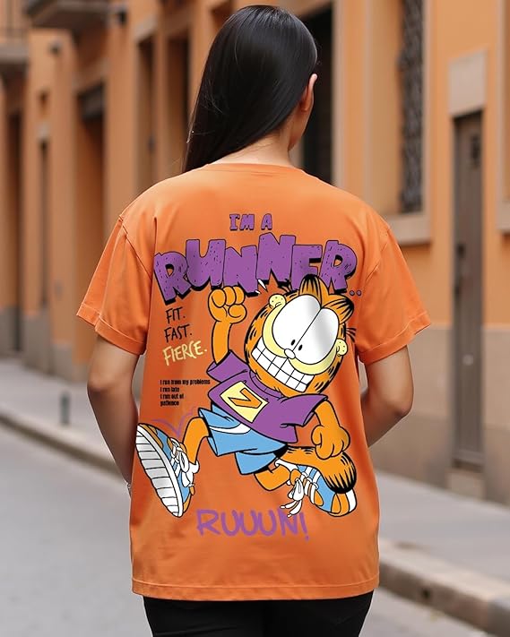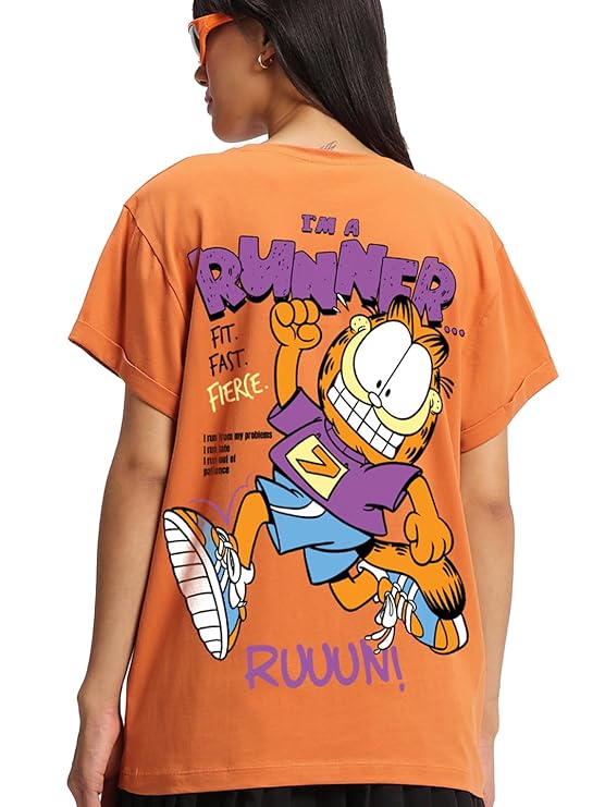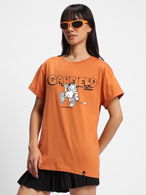 Bewakoof Women’s Cotton Relaxed Fit Official Garfield Merchandise Graphic Print Boyfriend Fit Round Neck T-Shirt